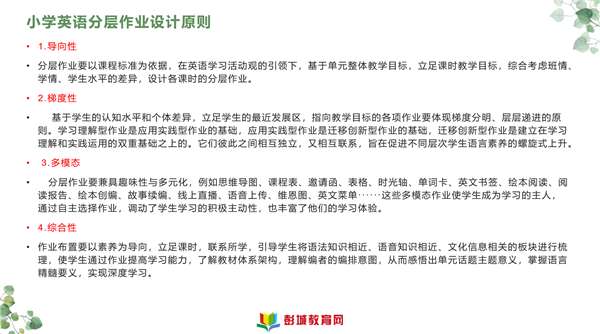 會(huì)議第二項(xiàng): 戴蕾老師帶領(lǐng)英語組的老師們認(rèn)真學(xué)習(xí)了小學(xué)英語分層作業(yè)設(shè)計(jì)原則,分別有導(dǎo)向性,梯度性,多模態(tài),綜合性四種原則,并進(jìn)行詳細(xì)的講解和分析。教師可以根據(jù)學(xué)生的實(shí)際情況、生活閱歷以及知識(shí)水平為學(xué)生創(chuàng)建多樣的學(xué)習(xí)情境,吸引學(xué)生主動(dòng)參與語言實(shí)踐類活動(dòng),使學(xué)生可以在使用語言的過程中產(chǎn)生創(chuàng)造性思維,引導(dǎo)學(xué)生在生活和社會(huì)中使用能力,讓學(xué)生可以做到學(xué)以致思,學(xué)以致用,學(xué)以創(chuàng)新。