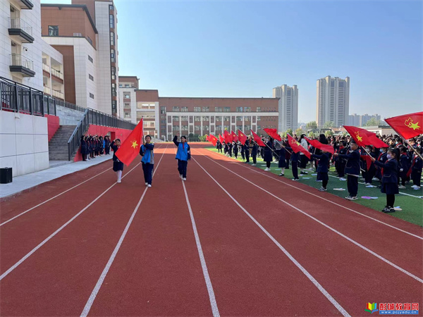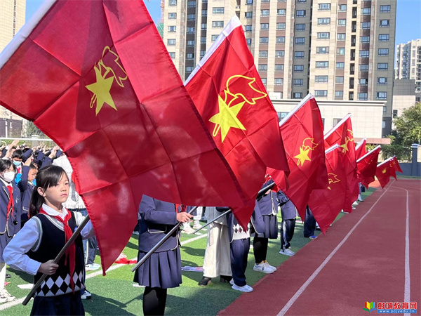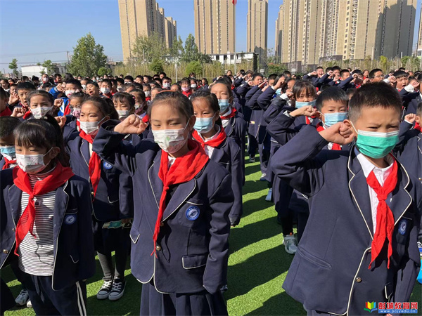 在鮮艷的隊旗下,新隊員們高舉右手,一起跟著輔導(dǎo)員李老師呼號。鏗鏘有力的呼號響徹校園的上空。