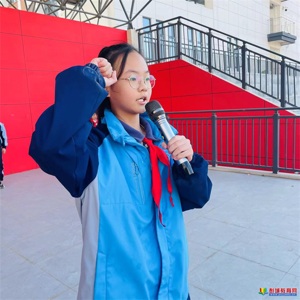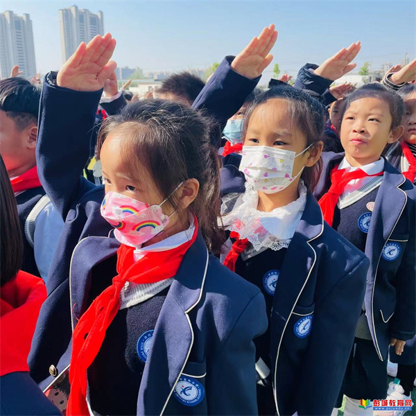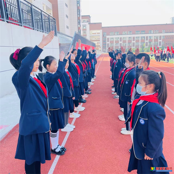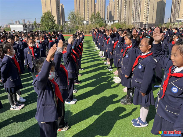 隊旗下,全體少先隊員舉起右拳,在大隊委盧笑語的帶領(lǐng)下莊嚴(yán)宣誓:“我是中國少年先鋒隊隊員,我在隊旗下宣誓……”童聲瑯瑯,卻鏗鏘有力!