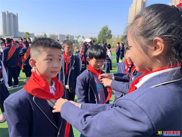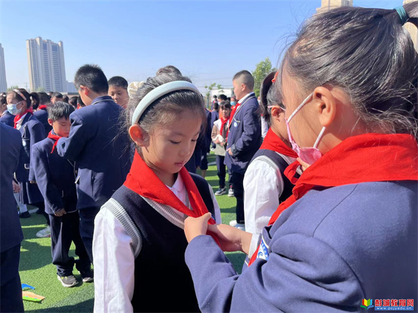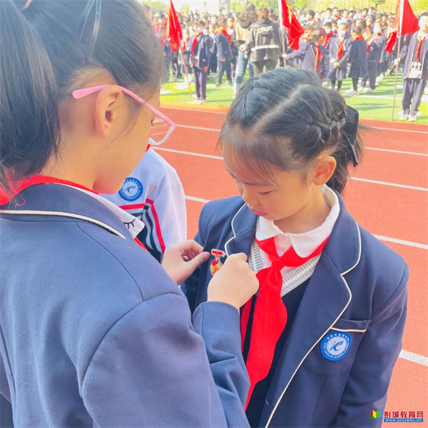 高年級的哥哥姐姐為新入隊成員,佩戴紅領(lǐng)巾。紅領(lǐng)巾是革命先烈傳給我們的火炬,它光芒萬丈,永遠(yuǎn)不熄!戴上紅領(lǐng)巾,就多一份責(zé)任!戴上紅領(lǐng)巾,就要為它添彩增光!戴上紅領(lǐng)巾,就要積極進(jìn)取,時刻準(zhǔn)備迎接新的挑戰(zhàn)!