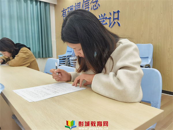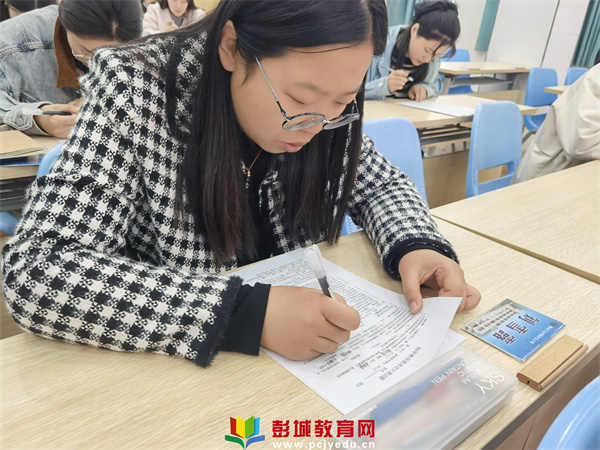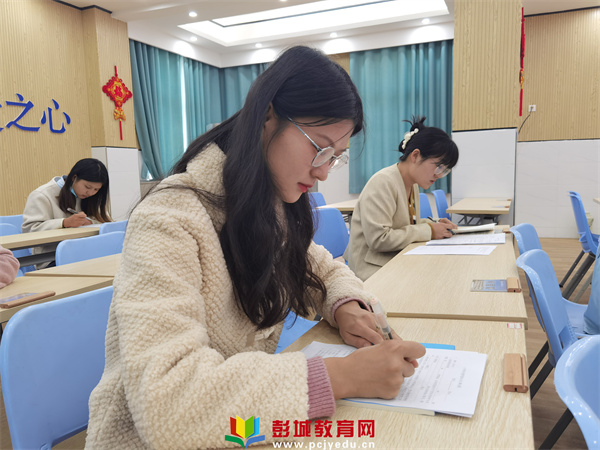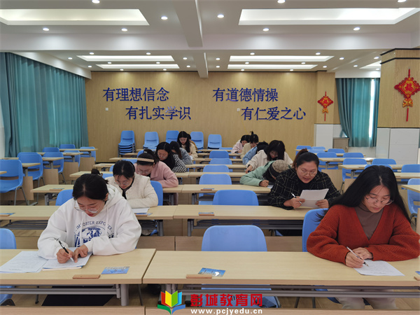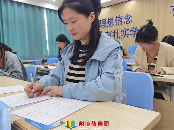 專業(yè)知識(shí)測試既重視對(duì)專業(yè)理論知識(shí)理解和掌握的考察,又注重在教學(xué)實(shí)踐中準(zhǔn)確應(yīng)用的檢測??紙鰞?nèi),教師們認(rèn)真審題,仔細(xì)圈畫,或冷靜思考,或認(rèn)真書寫,在規(guī)定時(shí)間內(nèi)交出了一份份深入思考并具有個(gè)人特色的答卷。