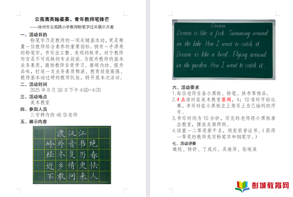 為全面提升青年教師教學(xué)基本功,夯實板書書寫能力,2025年8月30日下午,徐州市云苑路小學(xué)嚴(yán)格按照教師基本功訓(xùn)練要求,組織開展青年教師粉筆字比賽,全方位檢驗青年教師粉筆字書寫水平。