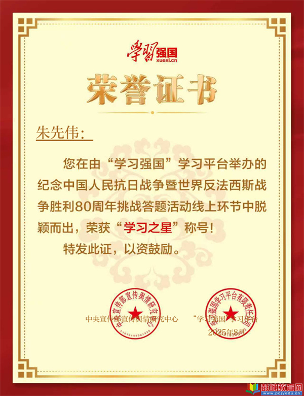 [摘要]:教育熱點(diǎn):為紀(jì)念中國(guó)人民抗日戰(zhàn)爭(zhēng)暨世界反法西斯戰(zhàn)爭(zhēng)勝利80周年,“學(xué)習(xí)強(qiáng)國(guó)”學(xué)習(xí)平臺(tái)、中央宣傳部輿情研究中心聯(lián)合舉辦了“紀(jì)念中國(guó)人民抗日戰(zhàn)爭(zhēng)暨世界反法西斯戰(zhàn)爭(zhēng)勝利80周年”挑戰(zhàn)答題活