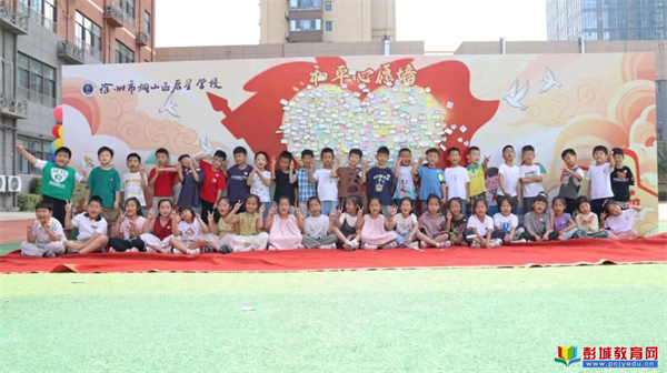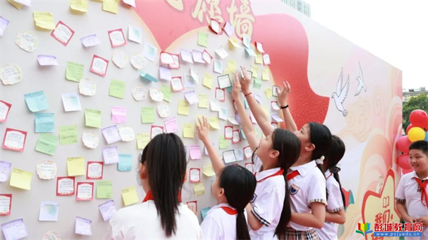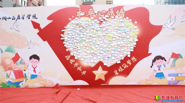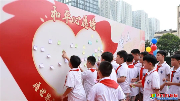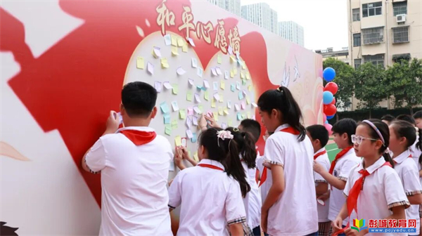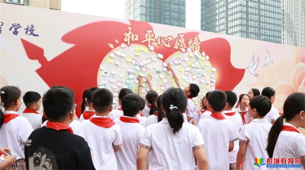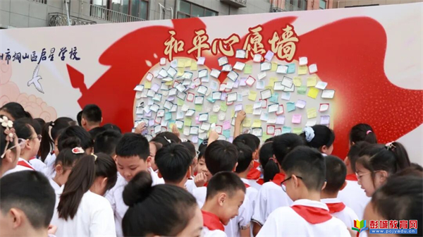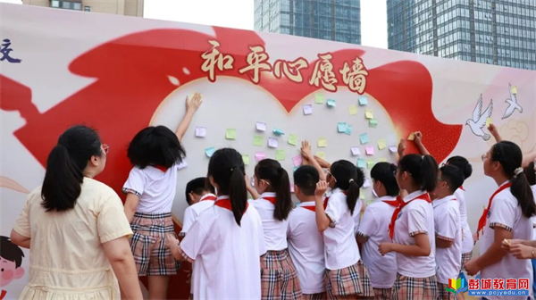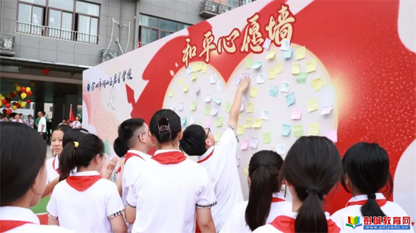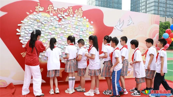 學(xué)生在和平心愿墻貼上美好的祝愿