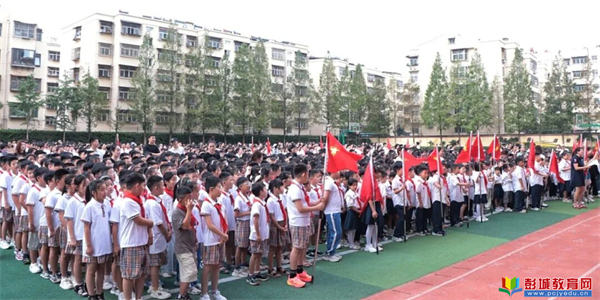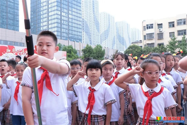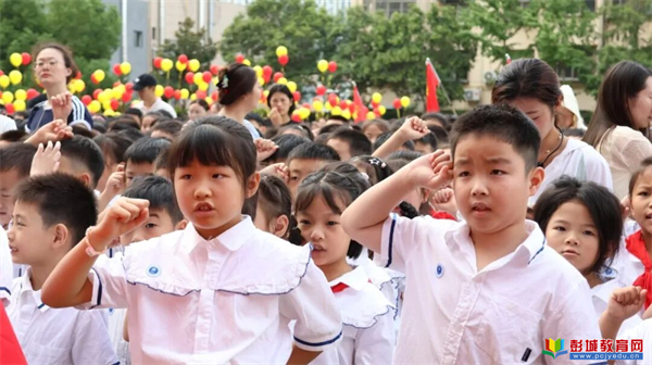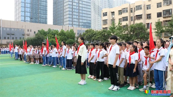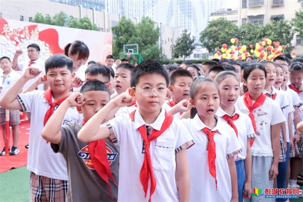 ??在少先大隊(duì)副大隊(duì)長翟若媛的帶領(lǐng)下,同學(xué)們莊嚴(yán)宣誓:“珍愛和平,勤奮學(xué)習(xí),自強(qiáng)不息……為中華民族偉大復(fù)興貢獻(xiàn)力量!”
