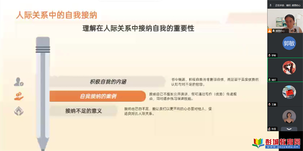 隨后,趙青老師圍繞“積極自我”展開分享。她先闡述了積極自我的理論框架,講解了自尊的雙重維度與類型,剖析自尊的構(gòu)成與不同表現(xiàn)形式,還介紹了自我效能感與行動(dòng)循環(huán),讓大家認(rèn)識(shí)到自我效能感的作用及其對(duì)行動(dòng)的影響。接著,趙青老師分享了積極自我的實(shí)踐路徑,包括優(yōu)勢(shì)充電法,以及動(dòng)機(jī)的層次與轉(zhuǎn)化、重塑歸因模式等內(nèi)容,給出在劣勢(shì)場(chǎng)景中利用優(yōu)勢(shì)提升自我的技巧,還有了解動(dòng)機(jī)類型及實(shí)現(xiàn)轉(zhuǎn)化、學(xué)會(huì)正確歸因促進(jìn)自我成長(zhǎng)的方法。最后,趙青老師對(duì)積極自我進(jìn)行總結(jié)與升華,深入解讀其核心理念,還拓展了積極自我相關(guān)理論應(yīng)用,如結(jié)合習(xí)得性樂觀理論、與樂觀風(fēng)格結(jié)合等。