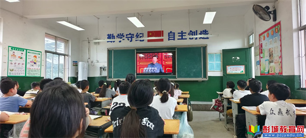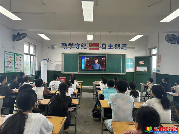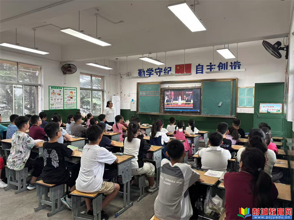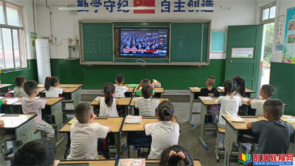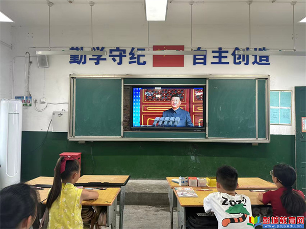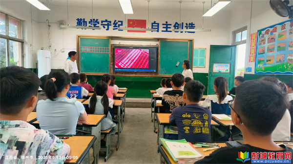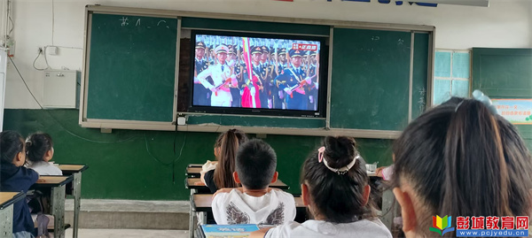 直播開始前,各班級老師提前在黑板上精心書寫了“觀看九三閱兵,弘揚愛國精神”等主題標(biāo)語。上午9時,閱兵儀式準(zhǔn)時開始,老師們?nèi)淘诎?,與學(xué)生們一同端坐屏幕前觀看。當(dāng)國歌奏響、五星紅旗升起時,全體學(xué)生起立,行注目禮、齊唱國歌。