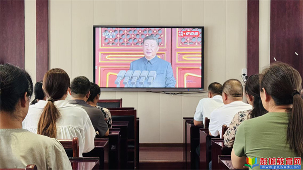 與此同時(shí),會(huì)議室里同樣氣氛濃厚。全體教師坐姿端正,認(rèn)真觀看每一個(gè)環(huán)節(jié),時(shí)而凝視屏幕記錄精彩瞬間,時(shí)而低聲交流內(nèi)心感悟。當(dāng)看到抗戰(zhàn)老兵方陣出現(xiàn)時(shí),不少老師眼中泛起淚光,深深為老一輩革命者的奉獻(xiàn)精神所動(dòng)容;空中梯隊(duì)呼嘯而過、留下絢麗彩煙的畫面,更是讓大家感受到祖國(guó)發(fā)展的蓬勃力量,現(xiàn)場(chǎng)響起自發(fā)的掌聲。