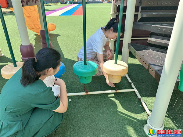 排查過程中,工作人員重點圍繞“校園環(huán)境、設施設備、消防安全”三大核心板塊展開。在校園環(huán)境與設施設備檢查中,小組對園區(qū)內的戶外活動場地、滑梯、秋千等游樂設施進行逐一檢修,緊固松動部件、清除尖銳邊角;同時對教室、午睡室的門窗、電源線路、插座開關進行細致排查,確保無漏電、松動等安全隱患。