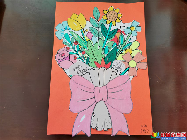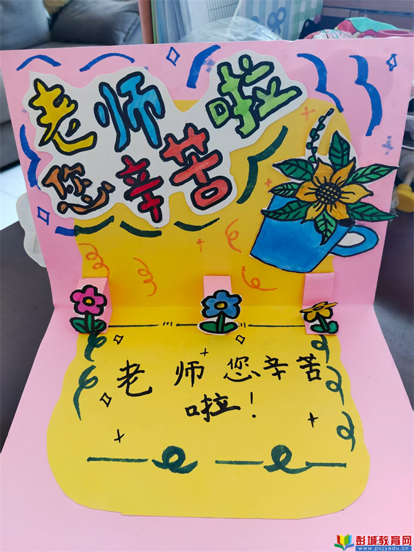三年級(jí)(1)班的王冠堯則發(fā)揮了自己的創(chuàng)意,在賀卡上設(shè)計(jì)了“互動(dòng)小機(jī)關(guān)”—— 打開賀卡,會(huì)彈出一朵立體紙花,花心里寫著 “老師,您辛苦了!”。為了做好這個(gè)機(jī)關(guān),他們專門向美術(shù)老師請(qǐng)教,反復(fù)折疊、粘貼,手指被膠水粘住也毫不在意,只為給老師一個(gè)驚喜。