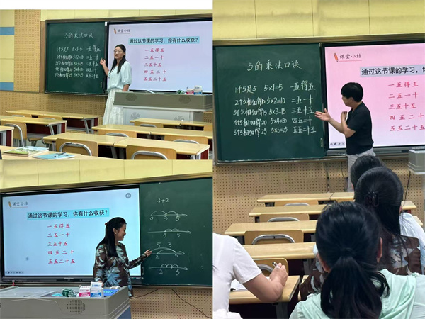 沙莉主任為王老師的課堂提出建議,可增加更多口訣互動環(huán)節(jié),口訣記憶方法可更多元,如加入節(jié)奏朗誦、手勢記憶等,可適當(dāng)滲透數(shù)學(xué)文化,介紹口訣的歷史淵源。接著,李佳慧老師把培訓(xùn)獲得的教材方面的改動分享給各位老師。最后張校長指出:《5的乘法口訣》是學(xué)生系統(tǒng)學(xué)習(xí)乘法的開端,至關(guān)重要。新教材的編排更加注重知識的形成過程。教師在教學(xué)時,不僅要讓學(xué)生記住口訣,更要讓他們理解口訣的來源與意義,打通加法與乘法之間的聯(lián)系,為后續(xù)學(xué)習(xí)其它乘法口訣奠定堅實的思維基礎(chǔ)。