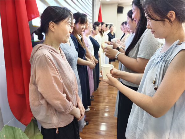 發(fā)言結(jié)束后,活動進入溫馨的敬茶環(huán)節(jié)。徒弟們手捧熱茶,向師傅鞠躬敬茶,一句句“師傅,請您喝茶”飽含敬意,師傅們接過茶杯,也傳遞出對徒弟的期許與關(guān)愛,現(xiàn)場氛圍溫暖而莊重。