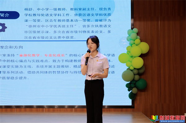 楊舒,中小學一級教師,教科室副主任,現(xiàn)負責學校教導處語文學科工作。曾獲區(qū)語文學科優(yōu)質(zhì)課一等獎、區(qū)青年教師基本功一等獎,被評為“徐州市中小學優(yōu)秀班主任”。多次執(zhí)教市、區(qū)級語文展示課,多篇論文在省市級刊物發(fā)表及獲獎。