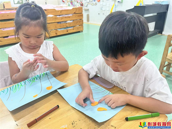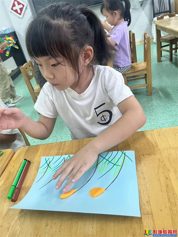 大三班則聚焦白露代表性植物“蘆葦”,開展手工創(chuàng)作活動。一場秋雨一場寒,迎風飄動的蘆葦帶來了秋的涼意,在老師耐心講解蘆葦的形態(tài)特征與白露的關聯(lián)后,孩子們便動手畫一畫,彩泥粘一粘,不一會兒,一束束形態(tài)各異的“手工蘆葦”就完成了,在動手實踐中加深了對節(jié)氣符號的印象。