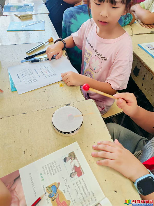 活動首節(jié),徐文涵老師執(zhí)教《聲音是怎樣產(chǎn)生的》。課堂上,徐老師以“實驗探究”為核心,設(shè)計了一系列有層次、有梯度的探究活動。從讓學生自主敲擊、撥動橡皮筋、尺子聽聲音,到引導大家觀察發(fā)聲物體的細微變化,再到敲擊鼓面、音叉看不到物體變化,通過在鼓面上放碎紙、用手觸摸音叉等方式感知物體在振動,最后“使發(fā)聲物體停止振動”的對比實驗,一步步帶領(lǐng)學生突破認知難點。學生們在動手操作中親身體驗,不僅清晰感知到“聲音由物體振動產(chǎn)生”,更直觀理解了“振動消失,聲音停止”的科學原理,充分展現(xiàn)了科學課“做中學、學中思”的魅力。