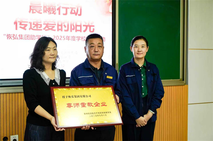 為表彰恢弘集團(tuán)對教育事業(yè)的持續(xù)貢獻(xiàn),徐州經(jīng)濟(jì)技術(shù)開發(fā)區(qū)科教局王少平副局長代表區(qū)科教局向恢弘集團(tuán)頒發(fā)“尊師重教企業(yè)”榮譽(yù)牌匾。企業(yè)代表接受榮譽(yù)并合影留念,將整場活動推向高潮。