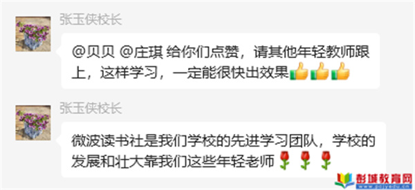 老師們的真知灼見在群里不斷刷屏,思維的火花激烈碰撞。張玉俠校長全程關(guān)注并高度肯定了本次活動(dòng)的成效。她為老師們的積極互動(dòng)點(diǎn)贊,并動(dòng)情地表示:“微波讀書社是我們學(xué)校的先進(jìn)學(xué)習(xí)團(tuán)隊(duì),學(xué)校的發(fā)展和壯大靠我們這些年輕老師!”