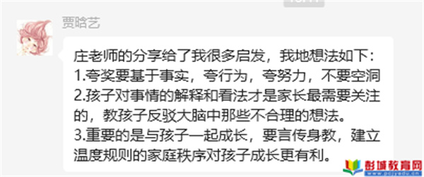 賈晗藝?yán)蠋煾形虻溃洫?jiǎng)要基于事實(shí)、夸行為而非空洞敷衍,同時(shí)要關(guān)注孩子對事件的看法,教會(huì)他們反駁不合理的想法,最終在與孩子的共同成長中言傳身教。