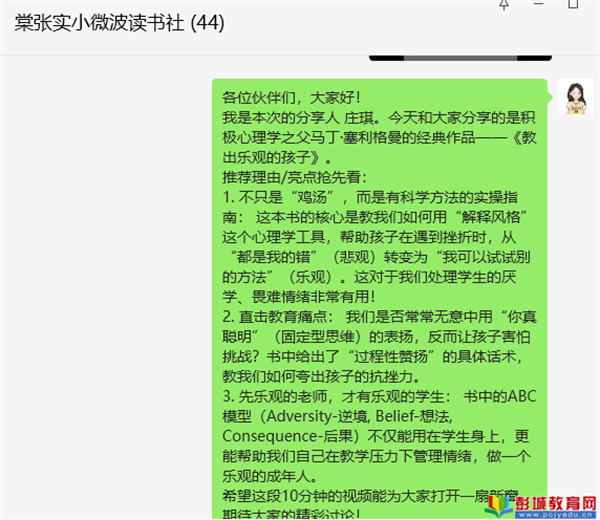 本次分享由莊琪老師擔(dān)任主講。她以積極心理學(xué)之父馬丁·塞利格曼的經(jīng)典著作《教出樂觀的孩子》為主題,通過一段精煉的視頻和精心準(zhǔn)備的導(dǎo)讀,為全體社員帶來了一場思想盛宴。莊老師在分享中指出,本書絕非簡單的“心靈雞湯”,而是一本擁有科學(xué)方法的實(shí)操指南。她重點(diǎn)介紹了“解釋風(fēng)格”這一核心心理學(xué)工具,闡述了如何幫助學(xué)生將悲觀的“都是我的錯(cuò)”轉(zhuǎn)變?yōu)闃酚^的“我可以試試別的方法”,這對于處理學(xué)生的厭學(xué)、畏難情緒極具價(jià)值。此外,她還分享了“過程性贊揚(yáng)”的具體話術(shù)和“ABC情緒模型”,啟發(fā)了老師們?nèi)绾慰茖W(xué)地表揚(yáng)學(xué)生、如何管理自身教學(xué)壓力,從而先成為一名樂觀的教師,再培養(yǎng)出樂觀的學(xué)生。