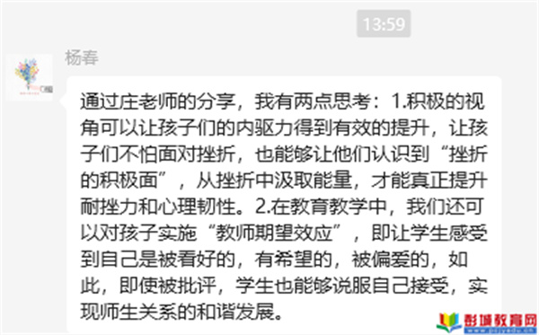 楊春老師從理論高度提出了兩點(diǎn)思考:一是積極的視角能有效提升孩子的內(nèi)驅(qū)力,讓其從挫折中汲取能量,提升心理韌性;二是可在教學(xué)中巧妙運(yùn)用“教師期望效應(yīng)”,讓學(xué)生感受到被看好和被偏愛,從而構(gòu)建和諧的師生關(guān)系。