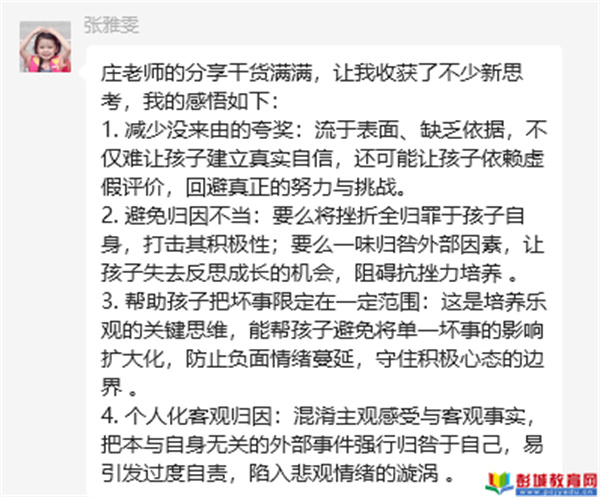 張雅雯老師的分享則充滿了思辨色彩,她提出要減少無來由的夸獎(jiǎng)、避免歸因不當(dāng),并重點(diǎn)分享了“幫助孩子把壞事限定在一定范圍”這一培養(yǎng)樂觀思維的關(guān)鍵方法,以及做好“個(gè)人化客觀歸因”的重要性,防止學(xué)生陷入過度自責(zé)。