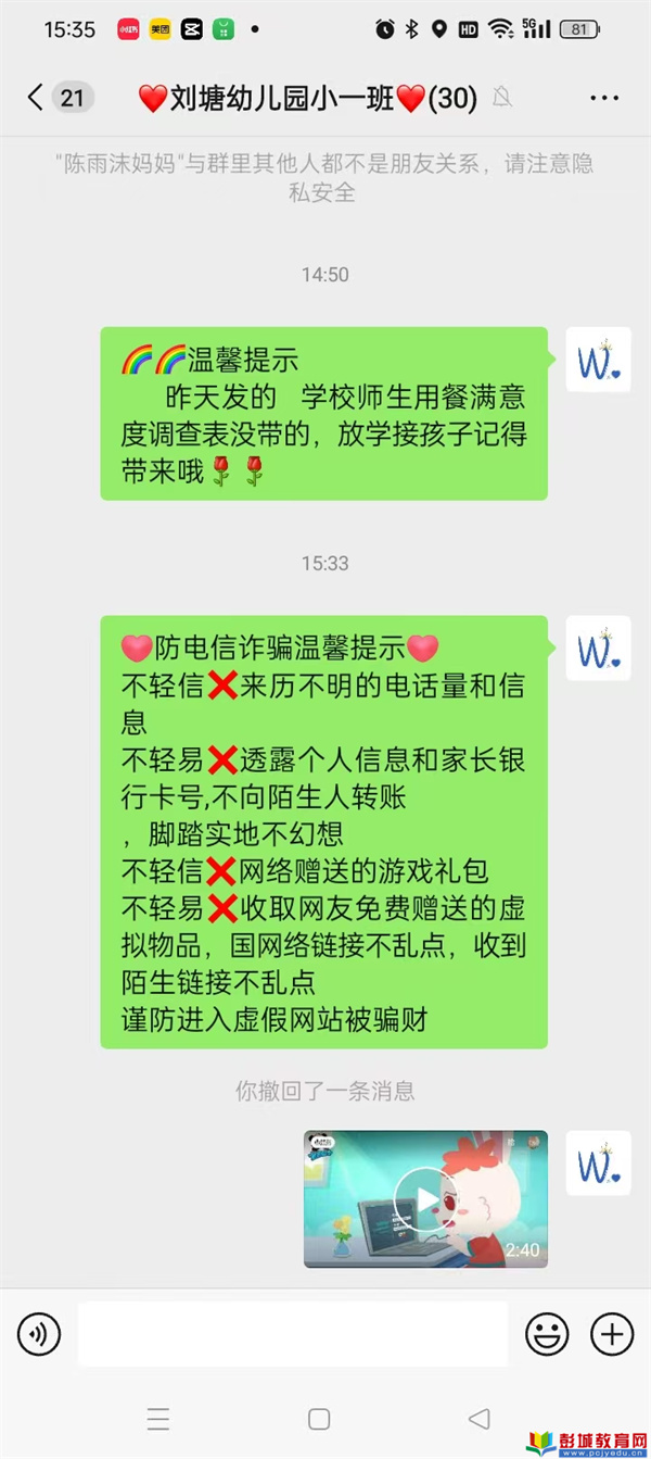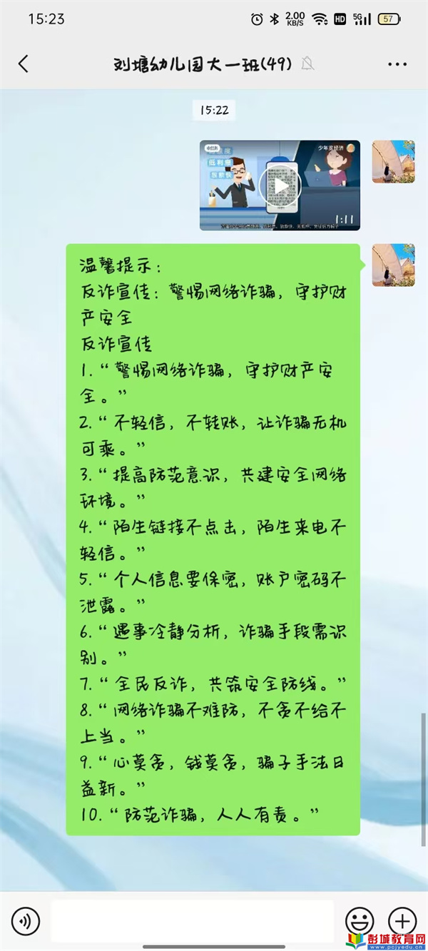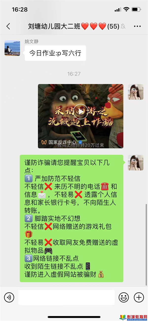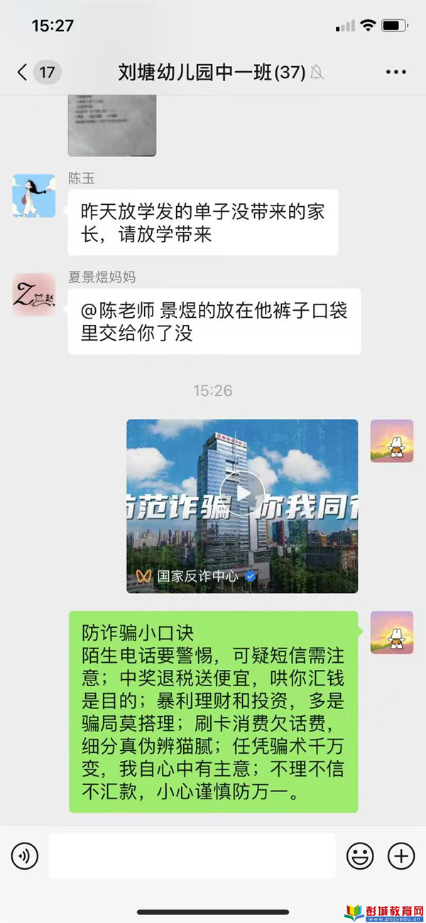 此外通過班級(jí)群向家長(zhǎng)推送防詐騙宣傳視頻幫助家長(zhǎng)識(shí)別、預(yù)防和拒絕詐騙的意識(shí)。