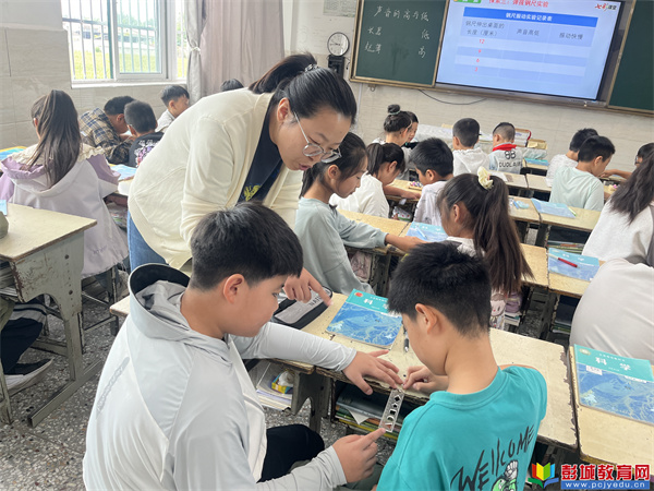 課堂伊始,仲老師以生活場景為切入點,通過播放鳥鳴、汽車鳴笛、鋼琴按鍵等不同音調(diào)的聲音片段,引導(dǎo)同學(xué)們直觀感受“聲音高低差異”,隨即拋出“為什么這些聲音不一樣高”的問題,自然開啟探究之旅。為將抽象的“音調(diào)”概念轉(zhuǎn)化為可感知的體驗,仲老師精心準(zhǔn)備了實驗器材:長短不一的鋼尺、粗細(xì)不同的橡皮筋、裝有不等量水的玻璃杯。在她的指導(dǎo)下,同學(xué)們分組動手操作——撥動鋼尺觀察振動快慢與聲音高低的關(guān)聯(lián),拉伸橡皮筋對比松緊程度對音調(diào)的影響,敲擊玻璃杯發(fā)現(xiàn)水量多少帶來的聲音變化。大家邊實驗邊記錄,踴躍分享發(fā)現(xiàn),在“動手實踐+合作交流”中逐步明晰“物體振動越快,聲音越高;振動越慢,聲音越低”的科學(xué)原理,課堂氛圍活躍且富有實效。