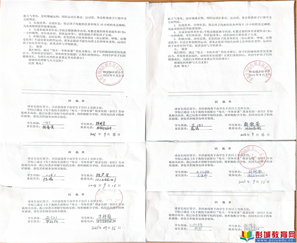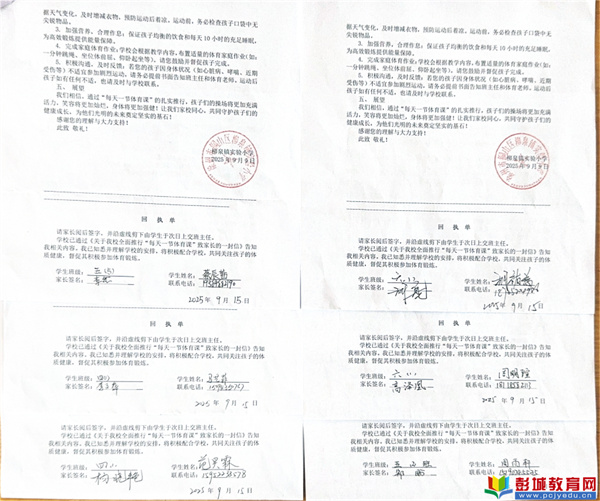 9月15日,學(xué)校向全體學(xué)生家長發(fā)放《關(guān)于我校全面推進“每天一節(jié)體育課”致家長的一封信》,從工作目標與意義、課程安排、師資與安全保障家校攜手等方面告知家長,形成家校共育,助力學(xué)生養(yǎng)成良好的鍛煉習(xí)慣,并悉數(shù)回收回執(zhí)單。