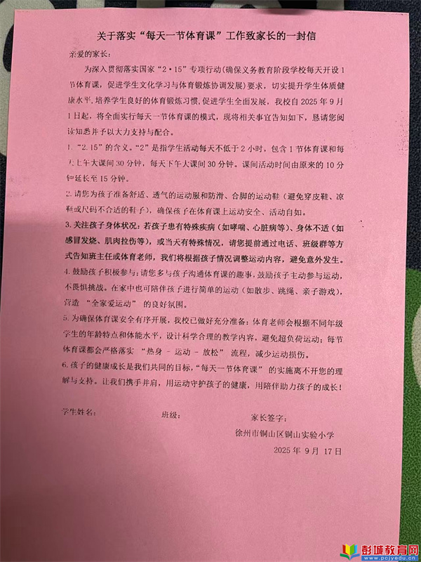 為深入貫徹落實(shí)國(guó)家“2·15”專(zhuān)項(xiàng)行動(dòng)(確保義務(wù)教育階段學(xué)校每天開(kāi)設(shè)1節(jié)體育課,促進(jìn)學(xué)生文化學(xué)習(xí)與體育鍛煉協(xié)調(diào)發(fā)展)要求,切實(shí)提升學(xué)生體質(zhì)健康水平,培養(yǎng)學(xué)生良好的體育鍛煉習(xí)慣,促進(jìn)學(xué)生全面發(fā)展,我校自2025年9月1日起,將全面實(shí)行每天一節(jié)體育課的模式
