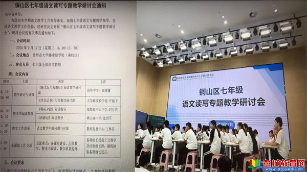 2025年 9月17日,銅山區(qū)七年級語文讀寫專題教學(xué)研討會在徐州市大學(xué)路實驗學(xué)校(南校區(qū))召開。研討會匯聚銅山區(qū)200余名七年級語文教師,著重聚焦語文讀寫專題教學(xué)核心議題,共探高效教學(xué)實施路徑,為進(jìn)一步推動語文課堂提質(zhì)增效、深化讀寫教學(xué)實踐凝聚智慧與力量。
