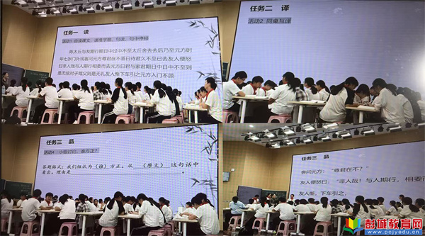 陳維娜老師憑借生動且富有感染力的拓展性講解,層層深入挖掘文本內(nèi)涵,緊扣文言教學(xué)核心,精準(zhǔn)解析字詞含義,梳理特殊文言句式,扎實落實文言文基礎(chǔ)知識點。又創(chuàng)新設(shè)計多種學(xué)生活動,引導(dǎo)學(xué)生以小組討論碰撞思維、以情境朗讀代入文本,在師生互動中深刻體會文言文承載的中國傳統(tǒng)文化底蘊與思想價值。