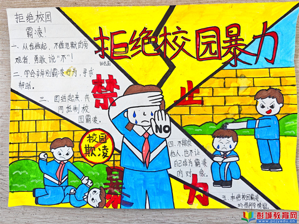 最后,為進(jìn)一步提高防欺凌法治意識,增強(qiáng)反欺凌意識,學(xué)校政教處組織同學(xué)們制作防欺凌手抄報,同學(xué)們積極參加,手抄報主題突出、內(nèi)容豐富、圖文并茂、貼合學(xué)生生活。表達(dá)了同學(xué)們遠(yuǎn)離校園暴力欺凌的決心。