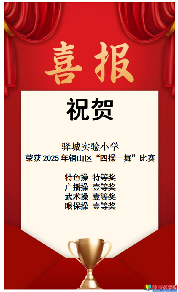 祝賀驛城實(shí)驗(yàn)小學(xué)在銅山區(qū)“四操一舞”比賽榮獲特色操-特等獎、廣播操-壹等獎、武術(shù)操-壹等獎、眼保操-壹等獎!