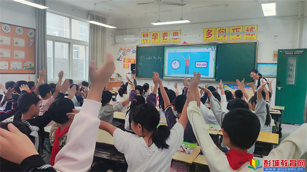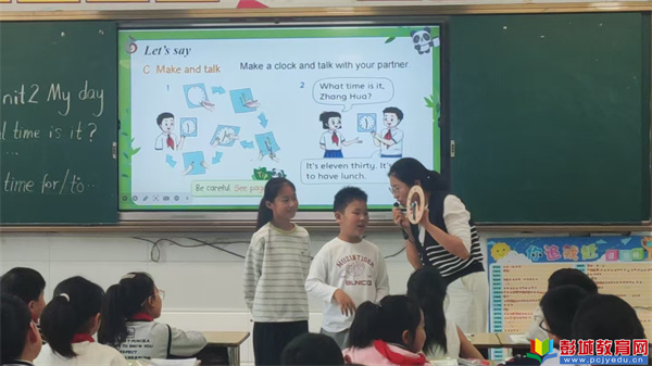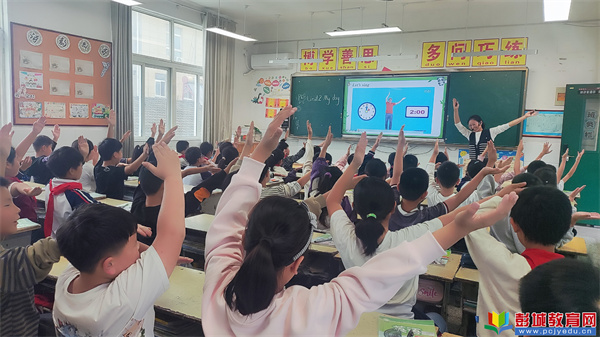 課堂伊始,張雪老師便用英文歌曲《What time is it?》點(diǎn)燃氛圍,歡快的旋律讓學(xué)生不自覺(jué)跟著哼唱;隨后的“the archer”游戲更是瞬間調(diào)動(dòng)積極性,學(xué)生們?cè)谌の痘?dòng)中快速聚焦“時(shí)間”主題,課堂氣氛即刻活躍起來(lái)。