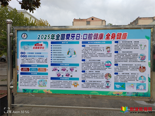 同時,學校通過設置“2025年全國愛牙日:口腔健康 全身健康”主題宣傳展板,全方位普及愛牙知識。展板詳細介紹了“愛牙八條”“正確刷牙步驟”“青少年口腔健康核心信息”等內容,以圖文并茂的形式,讓學生直觀了解口腔保健的要點,如每天有效刷牙兩次、使用含氟牙膏、定期口腔檢查等,還特別強調了青少年在牙齒矯正、運動護牙等方面的注意事項。