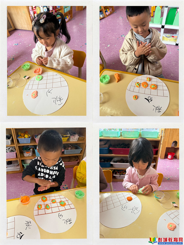 在創(chuàng)意手工環(huán)節(jié),孩子們化身“小小藝術(shù)家”,圍繞“秋分豐收”主題,用彩泥盡情創(chuàng)作。他們仔細(xì)揉捏、認(rèn)真塑形,一個個橙紅的柿子、翠綠的蔬菜在指尖誕生,被精心布置在圓形卡紙“田園”上。有的孩子還別出心裁地添加了“田埂”線條,讓作品更具田園氣息。每一件作品都風(fēng)格迥異,充滿童真,是孩子們對秋日豐收最直觀的想象與表達(dá)。