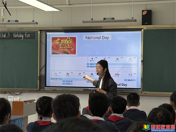 課堂伊始,孫老師借助課件中國慶節(jié)放假安排日歷、“National Day holiday”詞匯發(fā)音標(biāo)注等素材,自然引入“假期”主題,通過領(lǐng)讀、拼讀練習(xí),幫助學(xué)生快速掌握核心詞匯,同時(shí)滲透國慶節(jié)文化背景,激發(fā)學(xué)生的學(xué)習(xí)興趣與愛國情懷。