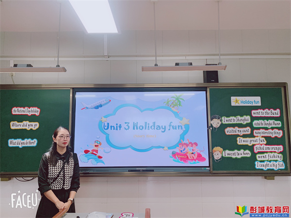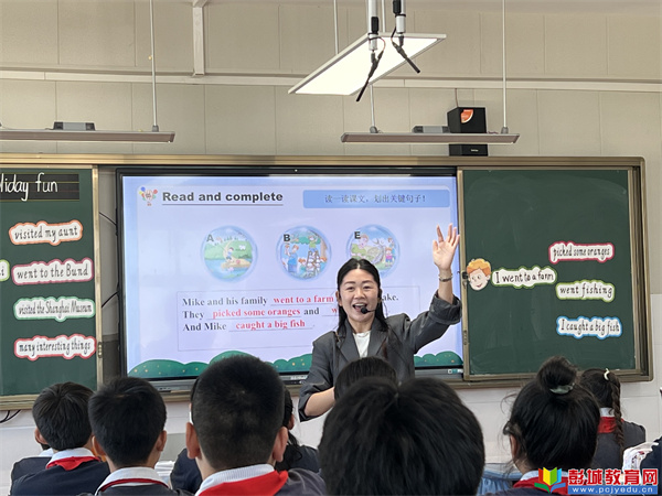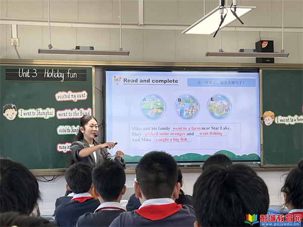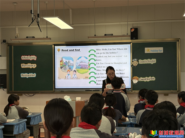 在核心的“Story time”環(huán)節(jié),孫老師以Liu Tao和Mike假期經(jīng)歷為主線,利用課件中上海外灘、上海博物館、星湖農(nóng)場等實(shí)景圖片,創(chuàng)設(shè)真實(shí)的語言情境。通過“Watch and answer”(觀看回答)、“Read and underline”(閱讀劃答案)等互動(dòng)任務(wù),引導(dǎo)學(xué)生探究兩人的假期去向——Liu Tao前往上海拜訪姑姑,游覽外灘與博物館;Mike則在星湖農(nóng)場摘橘子、釣魚。學(xué)生們圍繞“Where did they go?”“What did they do there?”等問題積極發(fā)言,教師適時(shí)點(diǎn)撥過去式用法(如“went”“visited”“caught”),讓語法知識(shí)在語境中自然落地。