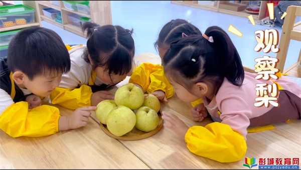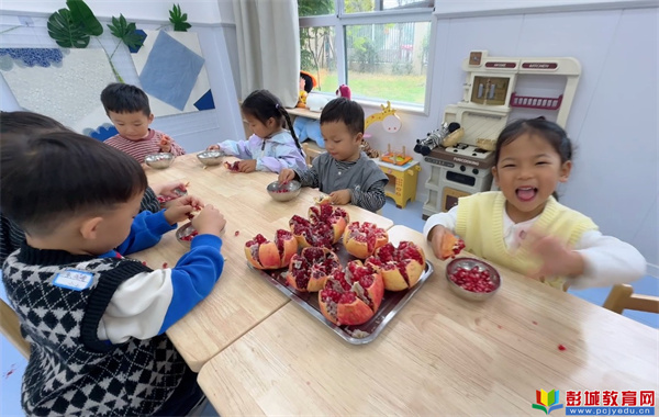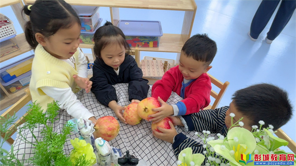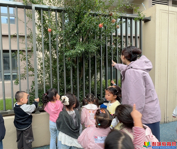 秋天是收獲的季節(jié)。老師將活動(dòng)搬到了戶外,帶孩子們觀察幼兒園里的石榴樹,有的已經(jīng)裂開了嘴巴。孩子們通過看、聞、比,全方位地認(rèn)識(shí)了秋季時(shí)令蔬果,了解了它們豐富的營(yíng)養(yǎng)價(jià)值,懂得了“順應(yīng)時(shí)節(jié)、健康飲食”的道理。
