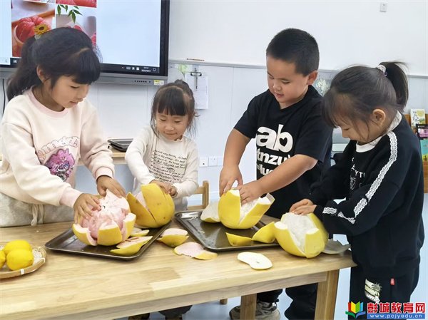 大班組:柚子茶。大班的哥哥姐姐們挑戰(zhàn)了更有難度的“柚子茶”制作。孩子們小心翼翼的把柚子肉剝出來,仔細(xì)地去掉白色皮的部分,并且把柚子肉掰成小塊。老師把孩子們剝好的柚子肉和處理好的柚子皮、冰糖和清水放到鍋里一起煮,等到黏乎乎后放涼,又交給孩子們加蜂蜜,品嘗。