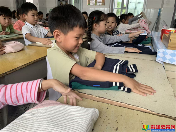 賽前,各班班主任通過生動(dòng)的示范和清晰的講解,將疊衣服的步驟編成“小口訣”:“衣領(lǐng)對(duì)齊放平展,兩袖交叉像擁抱,下擺向上折一折,方方正正真好看。”有趣的口訣瞬間點(diǎn)燃了孩子們的熱情,大家紛紛拿出自己的衣物,跟著老師一步步練習(xí)。