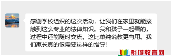 學(xué)生家長反饋:“感謝學(xué)校組織的這次活動,讓我們在家里就能接觸到這么專業(yè)的法律知識。我和孩子一起看的,過程中還能隨時交流,這比單純說教更有用。我們家長真的很需要這樣的指導(dǎo)!”