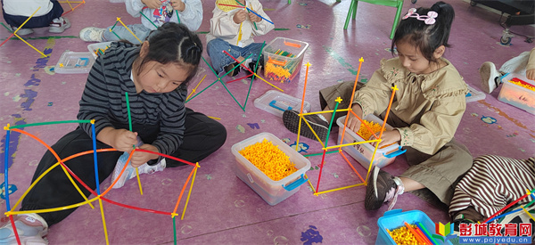 孩子們一拿到吸管材料,立刻被其五顏六色的外觀吸引,紛紛討論起來:“這不是喝水用的嗎?這怎么玩呀?”“我喜歡紅色,你喜歡什么顏色?”“我會(huì)玩,我玩過,我要搭建一個(gè)大城堡哈哈哈”……在熱烈地討論聲中孩子們也迅速投入到搭建中。他們發(fā)揮著自己獨(dú)特的想象力,有的搭建出高高的塔樓,有的則拼出有趣的機(jī)器人頭盔,有的拼接出旋轉(zhuǎn)的風(fēng)車……在這個(gè)過程中,小朋友們的手部精細(xì)動(dòng)作和手眼協(xié)調(diào)能力得到了很好的鍛煉,每一個(gè)專注的眼神,每一次小心翼翼的拼接,都是他們成長的印記。