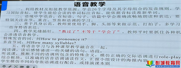 評(píng)課過后,楊曉平老師以“數(shù)據(jù)為基、策略為要”,為區(qū)域七年級(jí)英語教學(xué)指明路徑。她先對(duì)七年級(jí)學(xué)生開學(xué)調(diào)研測(cè)試的數(shù)據(jù)進(jìn)行細(xì)致剖析,針對(duì)不同層次學(xué)校的學(xué)情,給出詳實(shí)且具操作性的教學(xué)建議,讓每一所學(xué)校都能“找準(zhǔn)定位、精準(zhǔn)發(fā)力”。 隨后,她圍繞“小初銜接教學(xué)”提出四大核心策略:其一,引導(dǎo)小學(xué)教材再學(xué)習(xí)時(shí),推動(dòng)思維升級(jí)——讓學(xué)生從“列舉事實(shí)、尋找信息”的淺層學(xué)習(xí),走向“運(yùn)用知識(shí)、概括分析、理性評(píng)價(jià)”的高階探究;其二,架起文本與生活的橋梁,讓課堂活動(dòng)更具互動(dòng)性與開放性,讓英語學(xué)習(xí)真正“源于生活、用于生活”;其三,為課堂注入趣味活力,將音標(biāo)教學(xué)與自然拼讀深度融合,拒絕形式化,讓語言入門充滿樂趣;其四,堅(jiān)守“不拋棄”的教學(xué)原則,珍視小學(xué)知識(shí)的根基,讓銜接教學(xué)真正落地、避免浮于表面。 最后,楊老師對(duì)現(xiàn)階段教學(xué)提出四項(xiàng)明確要求,字字懇切、直擊要害:一是“慢下來”夯實(shí)基礎(chǔ)知識(shí),杜絕“眼高手低”,讓語用能力在扎實(shí)的根基上穩(wěn)步提升;二是高度重視語音教學(xué),讓標(biāo)準(zhǔn)的語音成為學(xué)生打開英語世界的“第一把鑰匙”;三是強(qiáng)化聽力與口語訓(xùn)練,讓英語成為“可聽、可說”的鮮活語言;四是落實(shí)英語學(xué)科活動(dòng)計(jì)劃,以豐富的活動(dòng)點(diǎn)燃學(xué)生的學(xué)習(xí)熱情,讓英語學(xué)習(xí)成為一種“享受”。