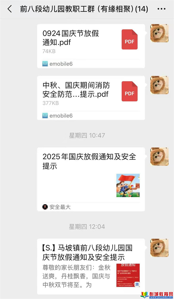 同時,各班教師通過班級微信群,向家長推送《國慶中秋假期安全告知書》,內(nèi)容涵蓋交通安全、防溺水、居家安全、食品安全、傳染病防護等多個維度,不僅明確了家長的監(jiān)護責任,還提供了實用的安全防護建議,如“帶幼兒外出時不遠離視線”“不讓幼兒獨自靠近河流、池塘”“選購食品時查看生產(chǎn)日期和保質(zhì)期”等,引導家長與幼兒園形成教育合力,共同守護幼兒安全。
