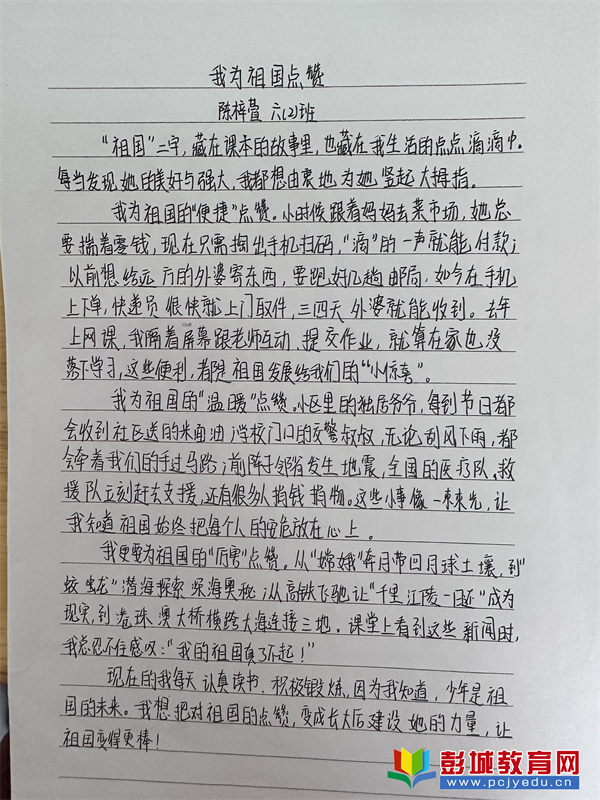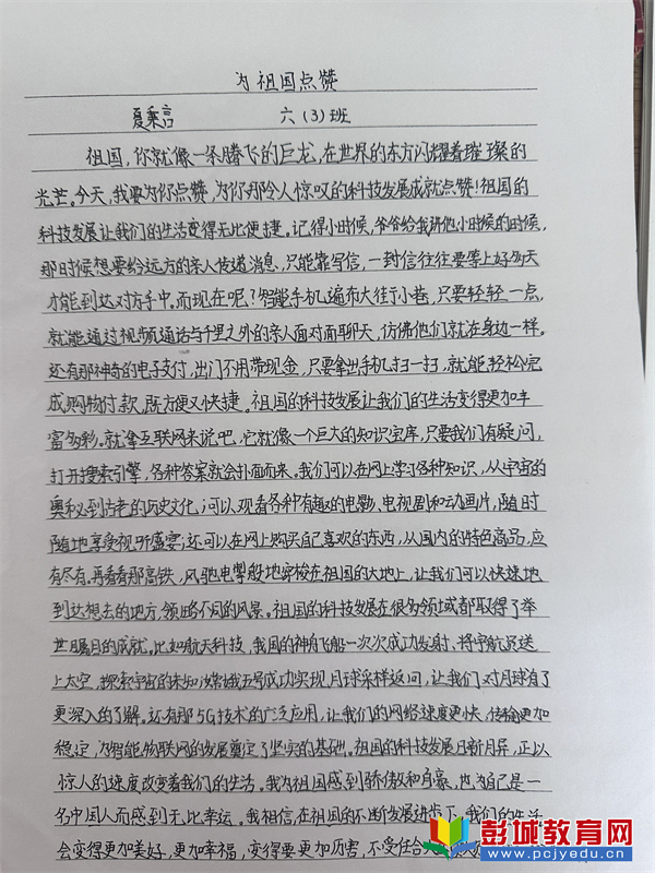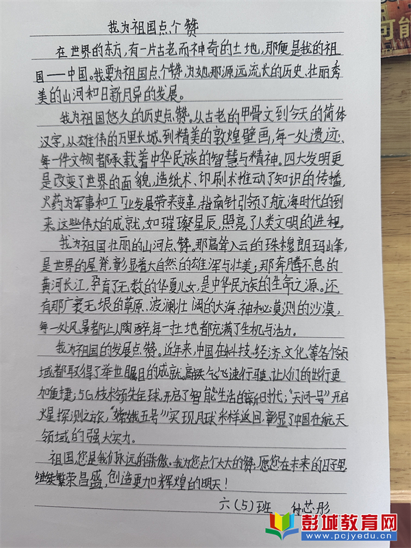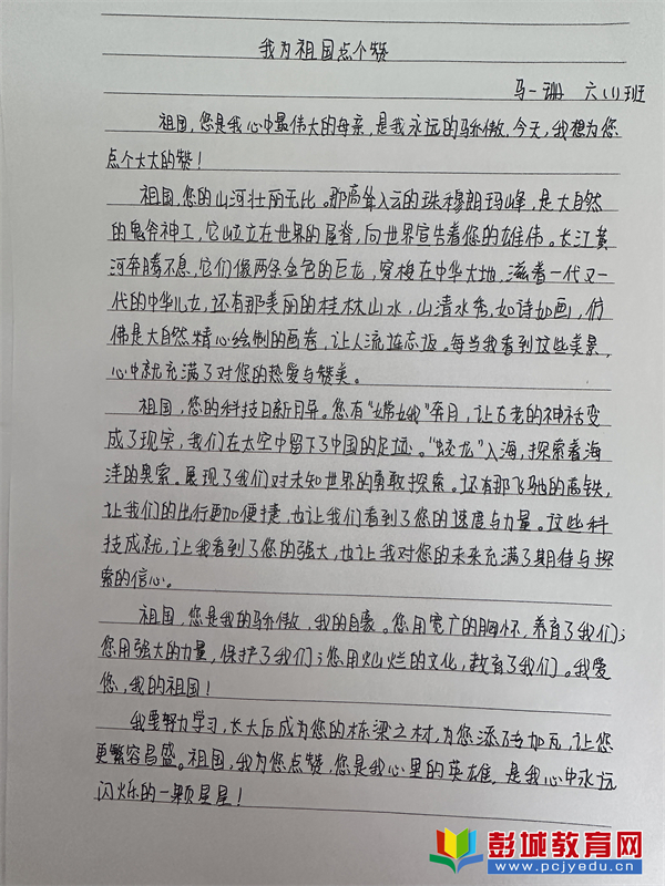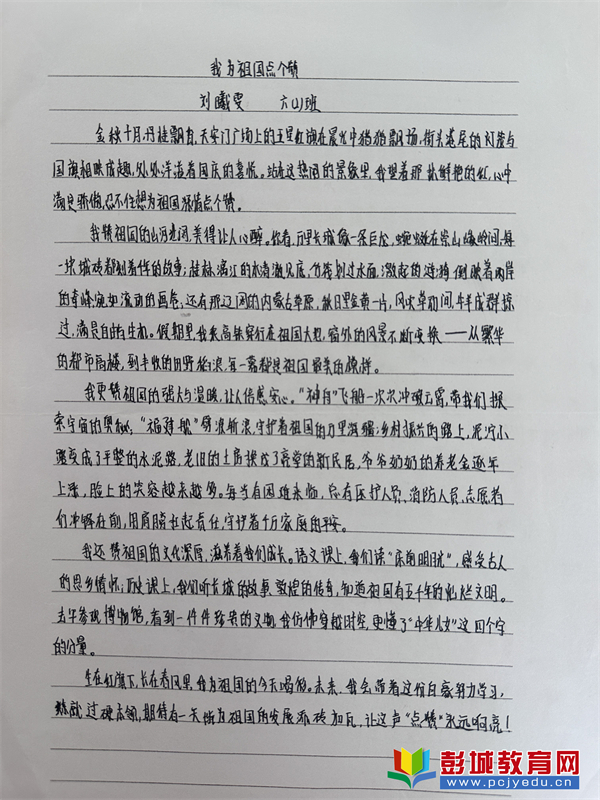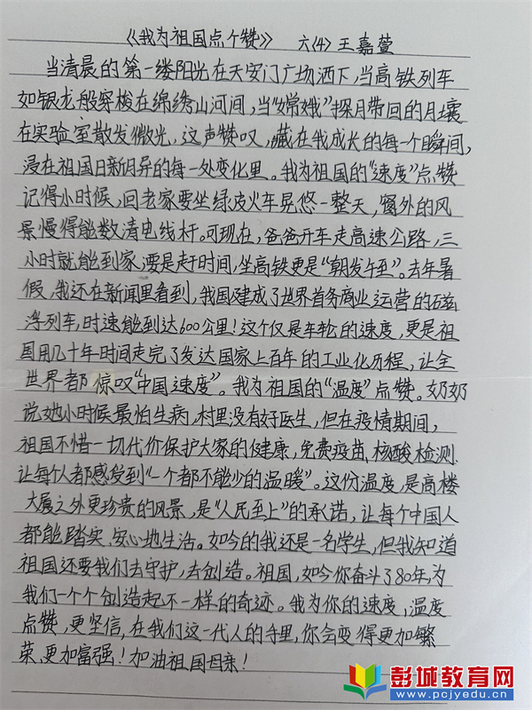 作為學(xué)校里的最高年級(jí),六年級(jí)同學(xué)以筆為媒,用文字表達(dá)對(duì)祖國(guó)的熱愛(ài)與祝福?!拔覟樽鎳?guó)點(diǎn)個(gè)贊”征文活動(dòng)激發(fā)了同學(xué)們的創(chuàng)作熱情。他們從高鐵飛馳、北斗組網(wǎng)寫(xiě)到家鄉(xiāng)巨變、文化傳承,字里行間充滿(mǎn)了對(duì)祖國(guó)飛速發(fā)展的由衷贊嘆和對(duì)民族未來(lái)的堅(jiān)定信心。一篇篇真情流露的文章,是少年們對(duì)祖國(guó)最熾熱的告白。