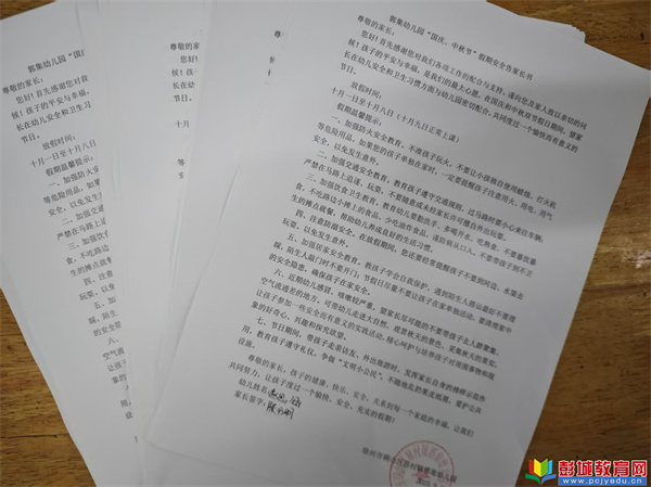 我們還通過微信群做好家長的安全宣傳工作,同時(shí)簽訂國慶假期安全告家長書,要求家長在假期間加強(qiáng)對(duì)孩子進(jìn)行安全教育,增強(qiáng)幼兒的自我保護(hù)意識(shí),并與家長簽訂了國慶假期安全告家長書,家園攜手共同做好安全教育與防范工作,確保幼兒過一個(gè)安全、健康、有意義的假期。