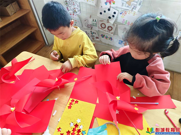 活動第二天,各班級設(shè)置了多個(gè)互動游戲,讓孩子們在玩中感受節(jié)日氛圍,沉浸式體驗(yàn)雙節(jié)樂趣。小中班的孩子們用紅色和黃色的卡紙,精心制作“情暖風(fēng)車”,他們高舉風(fēng)車在操場上奔跑,傳遞對祖國媽媽生日的祝福;在大班“我的一顆中國心”活動中,孩子們用紅色的毛線一圈圈的纏繞著愛心形狀的紙板上,一舉一動間滿是對祖國的喜愛。