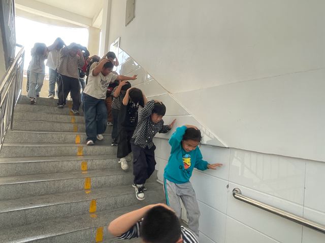地震預(yù)警信號(hào)突然響起,各班級(jí)班主任迅速指導(dǎo)學(xué)生雙手抱頭、彎腰下蹲,躲到課桌下方或教室承重墻角落,避開(kāi)門窗等危險(xiǎn)區(qū)域。30秒避險(xiǎn)時(shí)間后,疏散指令下達(dá),學(xué)生在老師的帶領(lǐng)下,沿著預(yù)定疏散路線,彎腰、抱頭、快速有序地向廣場(chǎng)空曠地帶撤離。整個(gè)過(guò)程中,沒(méi)有擁擠推搡,各班到達(dá)指定區(qū)域后迅速清點(diǎn)人數(shù),并向演練總指揮匯報(bào),全校師生僅用1分鐘便完成全部疏散。