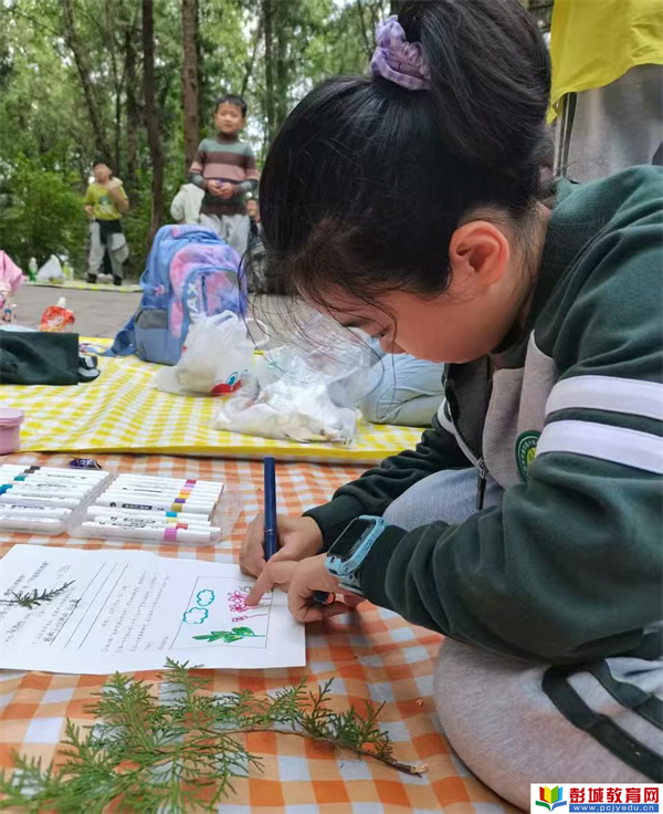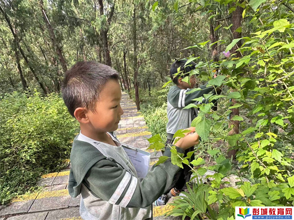 抵達(dá)子房山山體公園,最先迎接大家的是滿目的秋景。金黃的銀杏葉像一把把小扇子,隨風(fēng)輕輕搖曳;火紅的楓葉似跳躍的火焰,點(diǎn)燃了整個(gè)山坡;還有那掛滿枝頭的野果,紫的、紅的,像一顆顆小巧的寶石,引得同學(xué)們駐足觀察。在老師的帶領(lǐng)下,大家化身“自然小偵探”,小心翼翼地?fù)炱鹇湓诘厣系臉?shù)葉,對(duì)比它們的形狀、顏色和紋路,還認(rèn)真地在研學(xué)手冊(cè)上記錄下自己的發(fā)現(xiàn)——“楓葉的邊緣有鋸齒,像爺爺?shù)匿徸印薄般y杏葉是扇形的,掉在地上像小裙子”,童真的描述讓秋景多了幾分趣味。